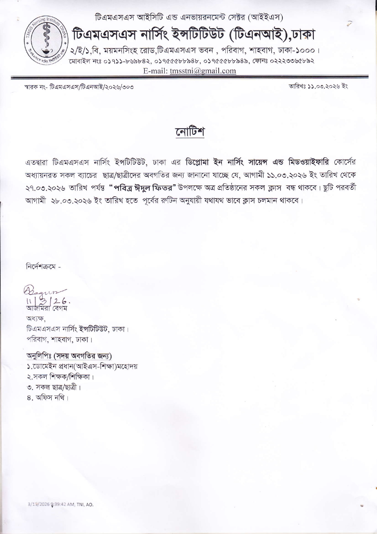 টিএমএসএস নার্সিং ইনস্টিটিউট (টিএনআই), ঢাকা এর সকল শিক্ষার্থীদের অবগতির জন্য জানানো যাচ্ছে যে ১১.০৩.২০২৬ থেকে ২৭.০৩.২০২৬ পর্যন্ত প্রতিষ্ঠানের সকল ক্লাস বন্ধ থাকবে। ২৮.০৩.২০২৬ থেকে পূর্বের রুটিন অনুযায়ী ক্লাস শুরু হবে।